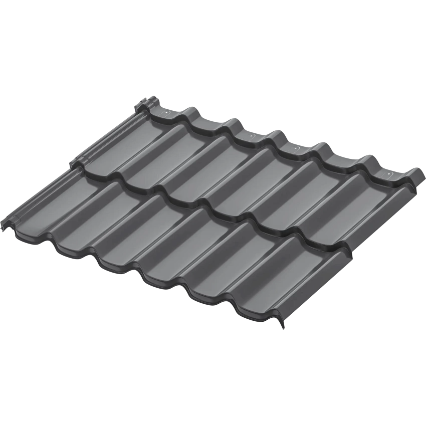 Металлическая модульная черепица Стокгольм XXL. Ключевым преимуществом металлической модульной черепицы AQUASYSTEM является скрытое крепление листов к обрешетке, что позволяет добиться непревзойдённой надёжности кровли и повышенной эстетики. Отличительной особенностью модульной черепицы являются стандартные размеры листов длиной в 2 модуля по 400 мм, что даёт колоссальные преимущества при хранении и транспортировке поддонов с черепицей. Имеет максимальную защиту от коррозии (первый класс цинкования) и повышенную УФ-стабильность.
